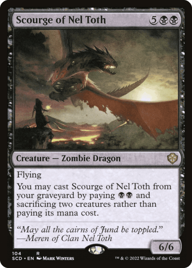 As soon as you start to cast Scourge of Nel Toth from your graveyard, it moves to the stack. At that point, it’s too late for an opponent to prevent you from casting it by removing it from your graveyard. It’s also too late for players to try to destroy the creatures you sacrifice to pay for the spell. — Casting Scourge of Nel Toth from your graveyard by paying the alternative cost doesn’t change when you can cast it. You can cast it only at the normal time you could cast a creature spell. — If you cast Scourge of Nel Toth from your graveyard, it is a spell and can be countered.