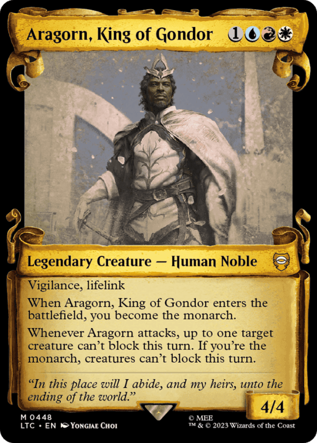 Vigilance, lifelink When Aragorn enters, you become the monarch. Whenever Aragorn attacks, up to one target creature can't block this turn. If you're the monarch, creatures can't block this turn.