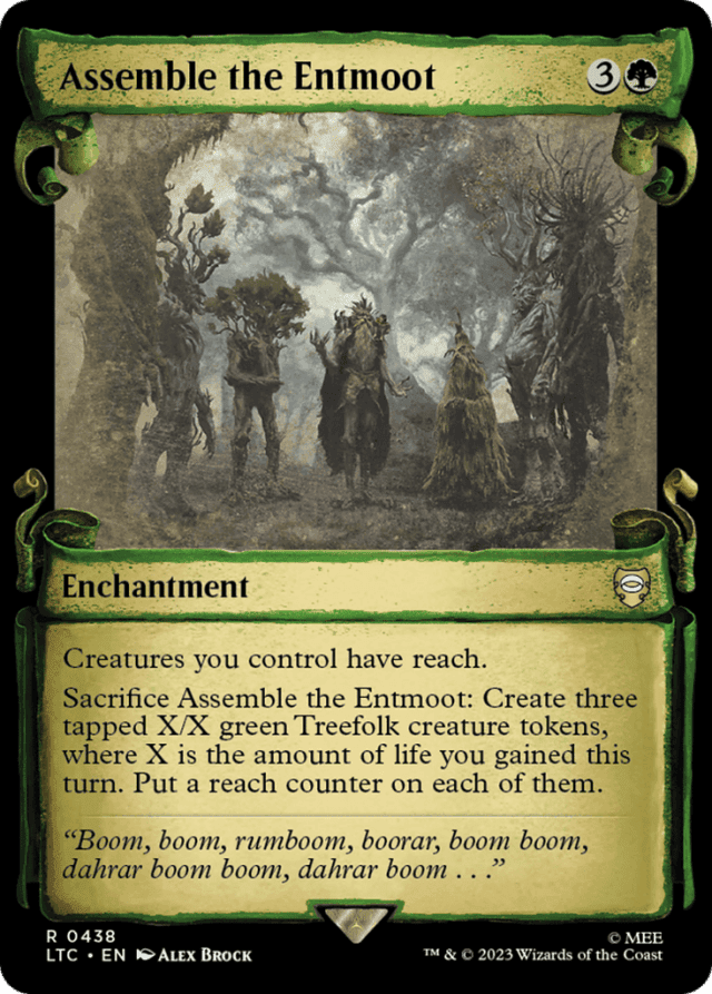 Creatures you control have reach. Sacrifice this enchantment: Create three tapped X/X green Treefolk creature tokens, where X is the amount of life you gained this turn. Put a reach counter on each of them.