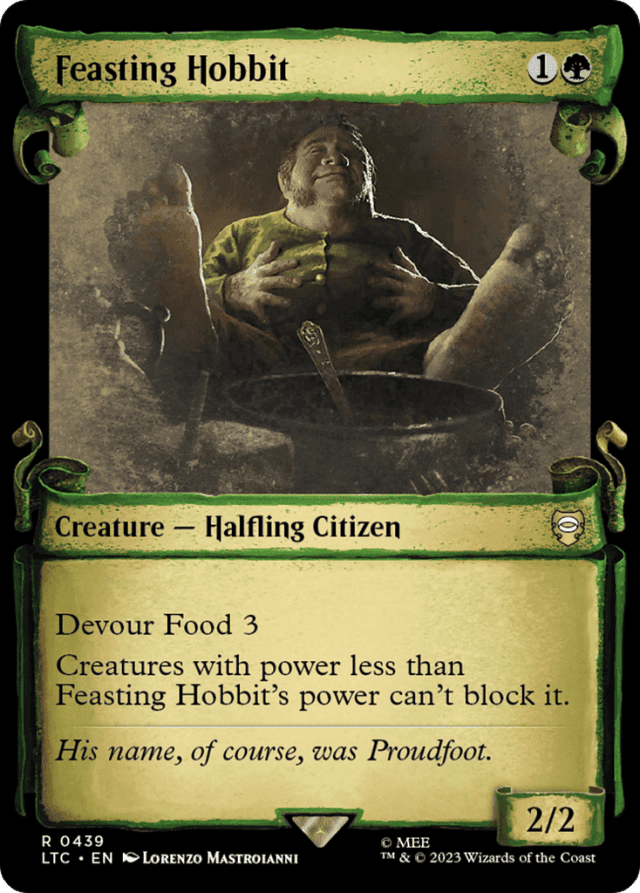 Devour Food is a variant of the devour ability. It allows you to sacrifice Foods rather than creatures, but otherwise functions identically to devour. — If you cast this spell, you choose how many and which Foods to devour as part of the resolution of the spell. (It can't be countered at that point.) — The comparison of power is done only when blockers are declared. Decreasing the power of a creature blocking Feasting Hobbit or increasing the power of Feasting Hobbit after this point won't cause Feasting Hobbit to become unblocked. — You may choose not to sacrifice any Foods for the devour Food ability. — Food is an artifact type. Even though it appears on some creatures, it's never a creature type. — If an effect refers to a Food, it means any Food artifact, not just a Food artifact token. For example, you can sacrifice Tough Cookie (an Artifact Creature — Food Golem) to activate Maraleaf Rider's ability (an ability with "Sacrifice a Food" in its cost). — Whatever you do, don't eat the delicious cards. — You can't sacrifice a Food to pay multiple costs. For example, you can't sacrifice a Food token to activate its own ability and also to activate Maraleaf Rider's ability.