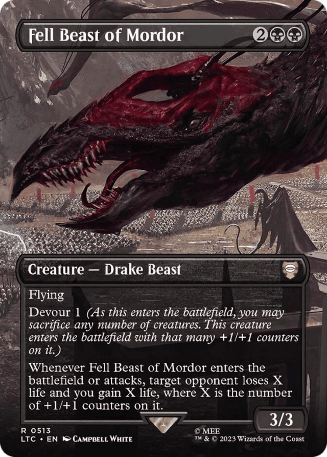 Fell Beast of Mordor can't devour creatures entering the battlefield at the same time as it. — If Fell Beast of Mordor isn't on the battlefield as its ability resolves, use the number of +1/+1 counters that were on it when it was last on the battlefield to determine the value of X.