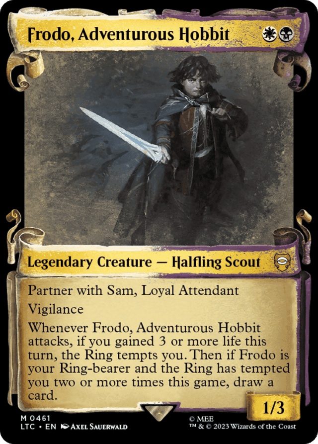 Partner with Sam, Loyal Attendant Vigilance Whenever Frodo attacks, if you gained 3 or more life this turn, the Ring tempts you. Then if Frodo is your Ring-bearer and the Ring has tempted you two or more times this game, draw a card.
