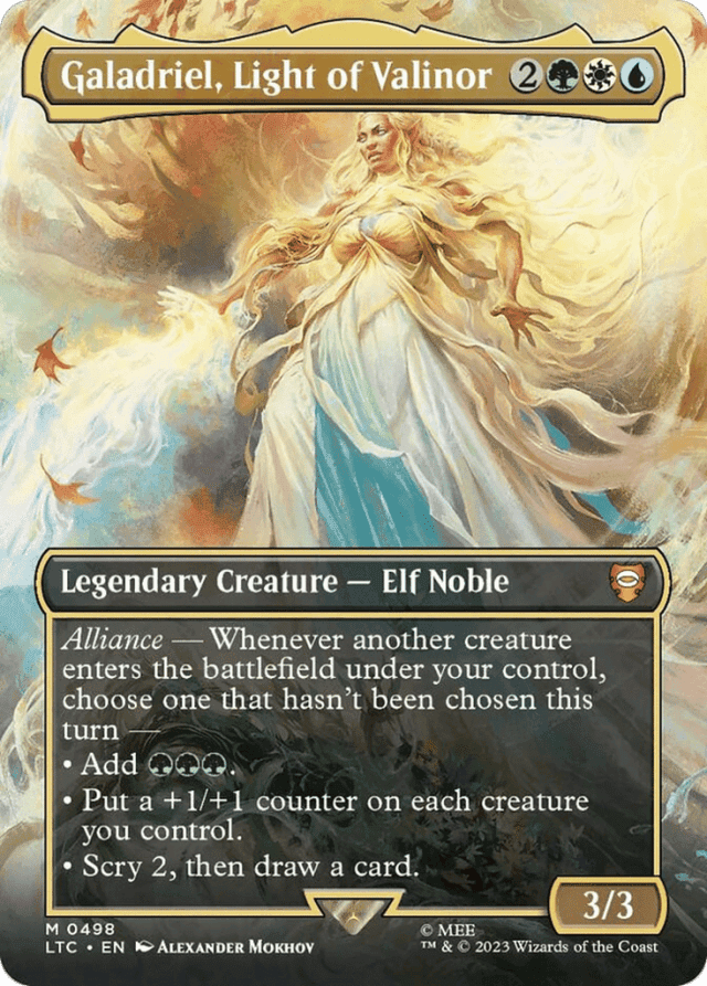 If all three modes have been chosen this turn, Galadriel, Light of Valinor's triggered ability is removed from the stack with no effect. — If multiple creatures enter the battlefield simultaneously, you must still choose different modes for each instance of the triggered ability that's put onto the stack. If more than three creatures enter the battlefield simultaneously, that choice is made only for the first three. — It doesn't matter who has chosen any particular mode. For example, say you control Galadriel, Light of Valinor and have chosen the first two modes this turn. If an opponent gains control of Galadriel, that player can choose only the third mode this turn. — The phrase "that hasn't been chosen this turn" refers only to that specific Galadriel, Light of Valinor. If Galadriel leaves the battlefield and then returns to the battlefield later in the turn, it will be a new object with no memory of the modes chosen when it was previously on the battlefield.