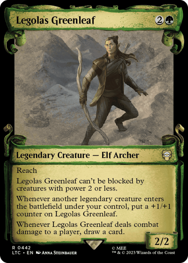 Reach Legolas can't be blocked by creatures with power 2 or less. Whenever another legendary creature you control enters, put a +1/+1 counter on Legolas. Whenever Legolas deals combat damage to a player, draw a card.
