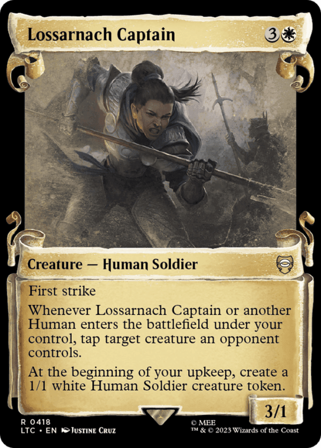First strike Whenever this creature or another Human you control enters, tap target creature an opponent controls. At the beginning of your upkeep, create a 1/1 white Human Soldier creature token.