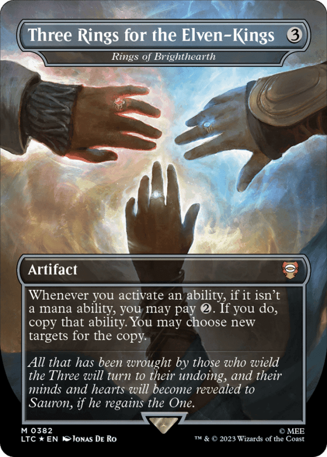 An activated mana ability is one that produces mana as it resolves, not one that costs mana to activate. — If paying the activation cost of the ability includes sacrificing Rings of Brighthearth, the ability won't be copied. At the time the ability is considered activated (after all costs are paid), Rings of Brighthearth is no longer on the battlefield. — If the ability has {X} in its cost, the copy uses the same value of X. — The copy will have the same targets as the ability it's copying unless you choose new ones. You may change any number of the targets, including all of them or none of them. If, for one of the targets, you can't choose a new legal target, then it remains unchanged (even if the current target is illegal). — The triggered ability of Rings of Brighthearth and the copy it creates both resolve before the ability that caused it to trigger. They resolve even if that ability is countered. — You can't pay {2} more than once for each time the triggered ability of Rings of Brighthearth resolves.
