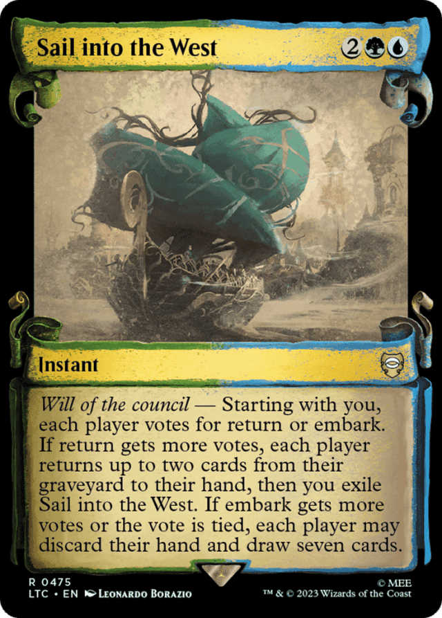 Will of the council — Starting with you, each player votes for return or embark. If return gets more votes, each player returns up to two cards from their graveyard to their hand, then you exile Sail into the West. If embark gets more votes or the vote is tied, each player may discard their hand and draw seven cards.