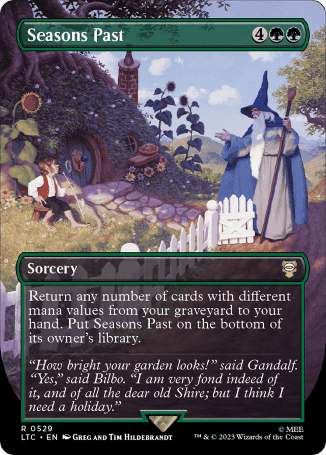 Return any number of cards with different mana values from your graveyard to your hand. Put Seasons Past on the bottom of its owner's library.