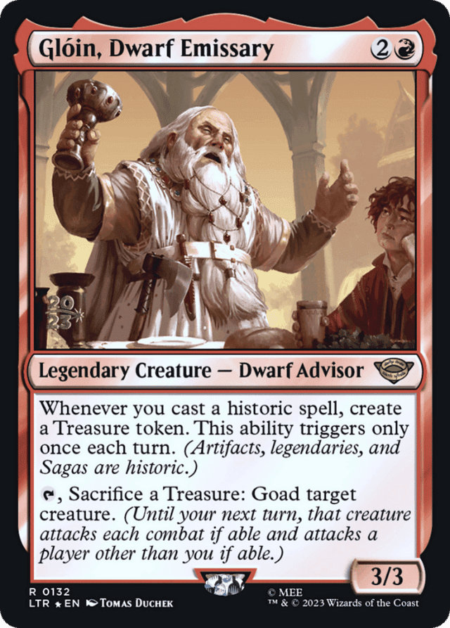 Whenever you cast a historic spell, create a Treasure token. This ability triggers only once each turn. (Artifacts, legendaries, and Sagas are historic.) {T}, Sacrifice a Treasure: Goad target creature. (Until your next turn, that creature attacks each combat if able and attacks a player other than you if able.)