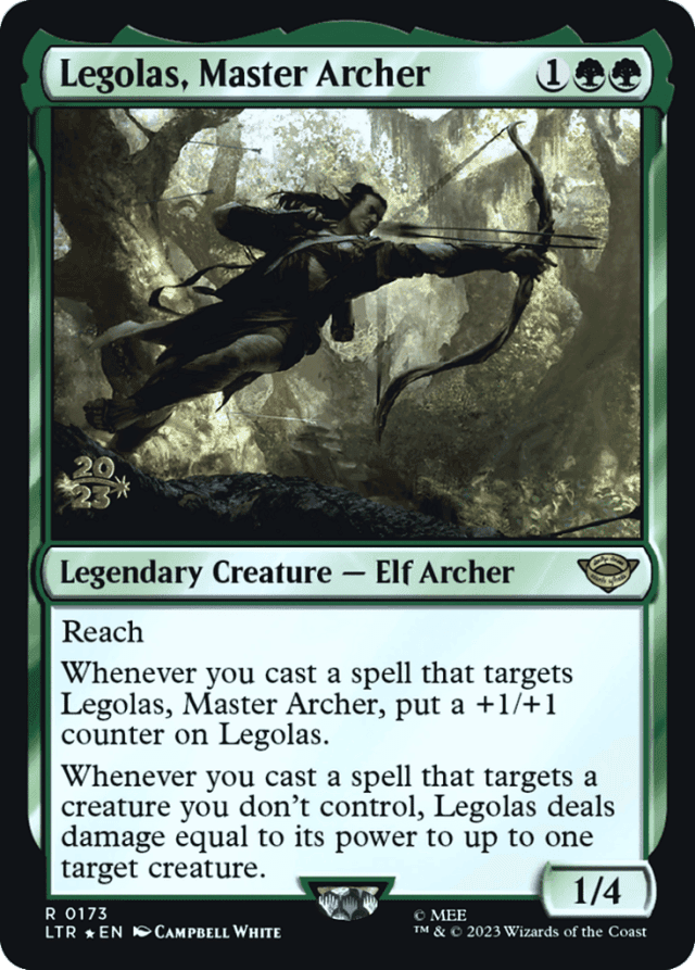 Reach Whenever you cast a spell that targets Legolas, put a +1/+1 counter on Legolas. Whenever you cast a spell that targets a creature you don't control, Legolas deals damage equal to its power to up to one target creature.