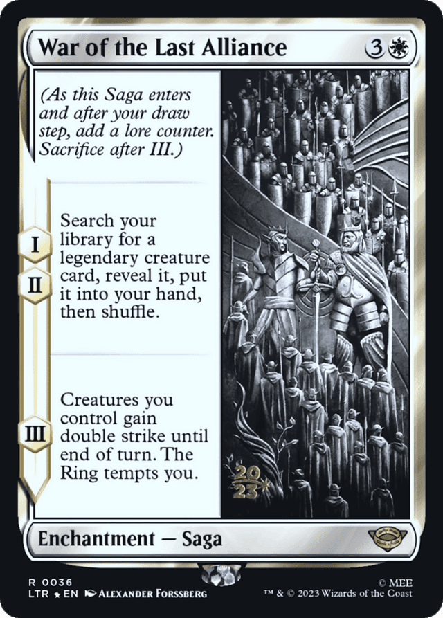 (As this Saga enters and after your draw step, add a lore counter. Sacrifice after III.) I, II — Search your library for a legendary creature card, reveal it, put it into your hand, then shuffle. III — Creatures you control gain double strike until end of turn. The Ring tempts you.