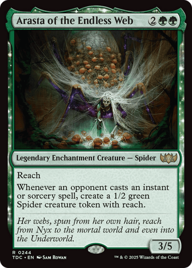 Reach Whenever an opponent casts an instant or sorcery spell, create a 1/2 green Spider creature token with reach.