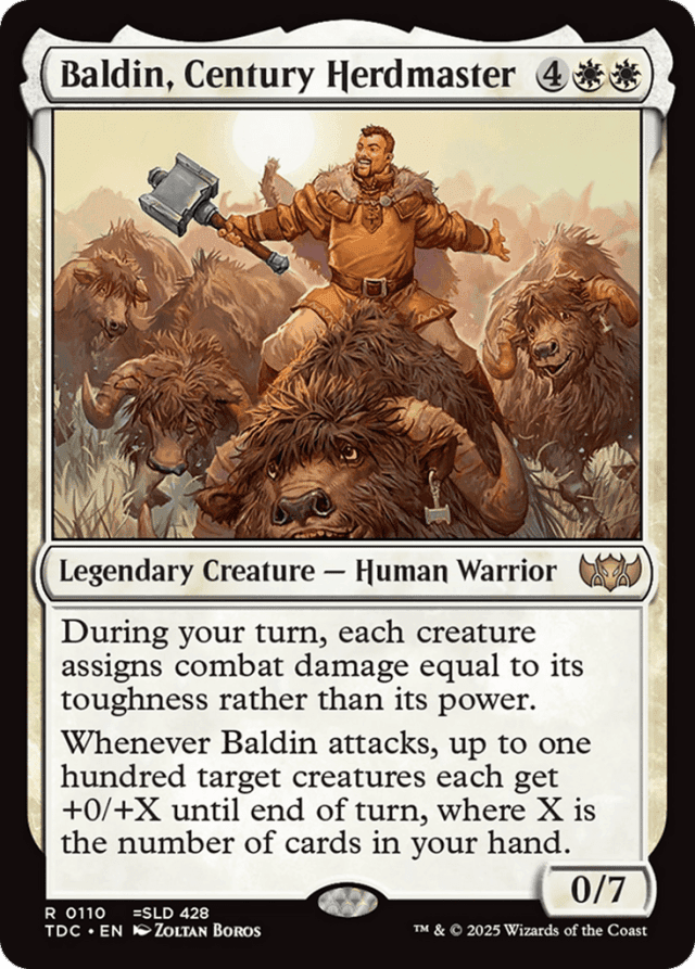 During your turn, each creature assigns combat damage equal to its toughness rather than its power. Whenever Baldin attacks, up to one hundred target creatures each get +0/+X until end of turn, where X is the number of cards in your hand.