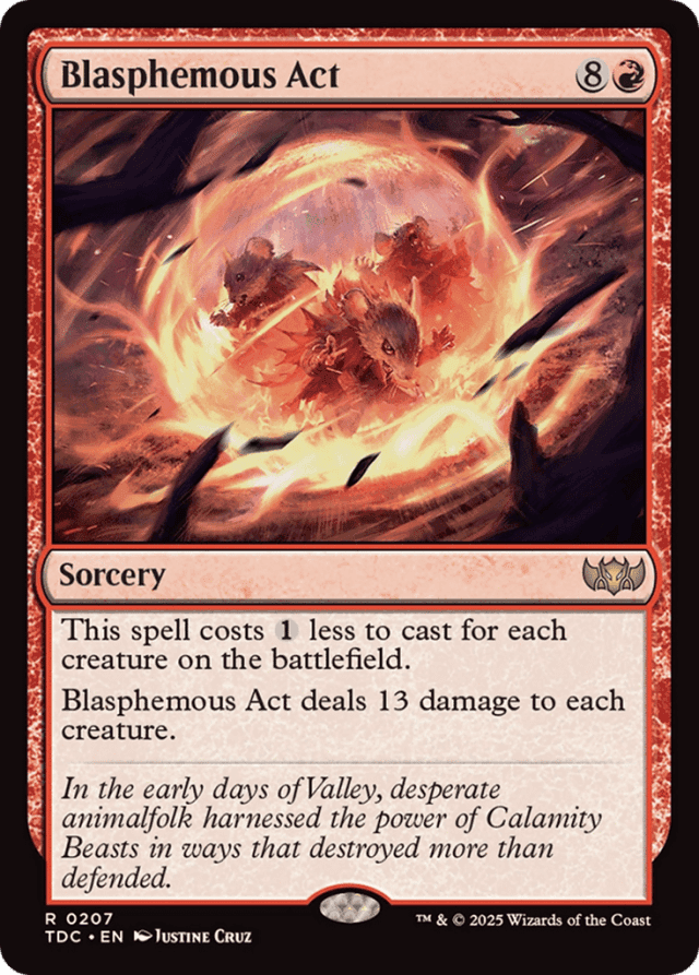 This spell costs {1} less to cast for each creature on the battlefield. Blasphemous Act deals 13 damage to each creature.