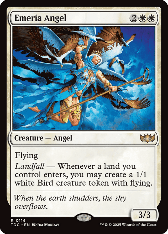Flying Landfall — Whenever a land you control enters, you may create a 1/1 white Bird creature token with flying.