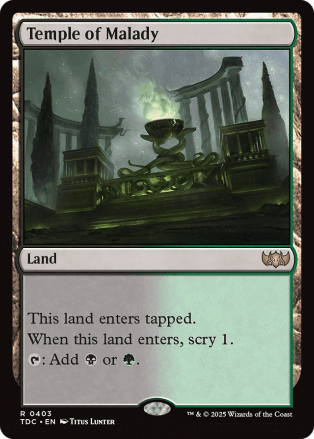 This land enters tapped. When this land enters, scry 1. (Look at the top card of your library. You may put that card on the bottom.) {T}: Add {B} or {G}.