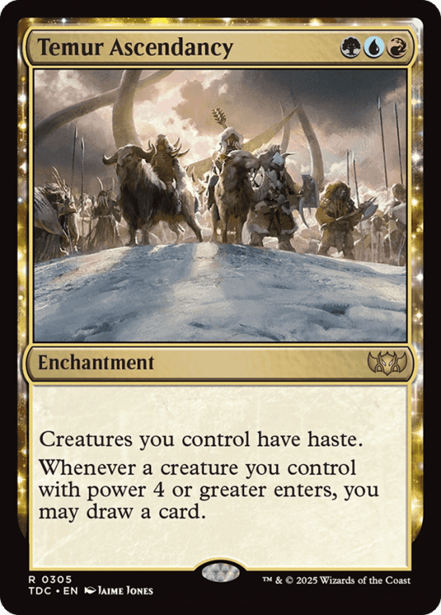 If Temur Ascendancy leaves the battlefield, creatures you control lose haste. If they haven't been under your control since the turn began and don't otherwise have haste, they can't attack this turn. If they've already attacked, they remain attacking creatures. — If a creature is entering the battlefield under your control, consider static abilities to determine whether its power is 4 or greater. Spells, activated abilities, and triggered abilities can't be used to raise the creature's power in time to have Temur Ascendancy's last ability trigger or to lower it in time to stop it from triggering. — Once the last ability of Temur Ascendancy has triggered, lowering the power of the creature won't stop you from drawing a card.