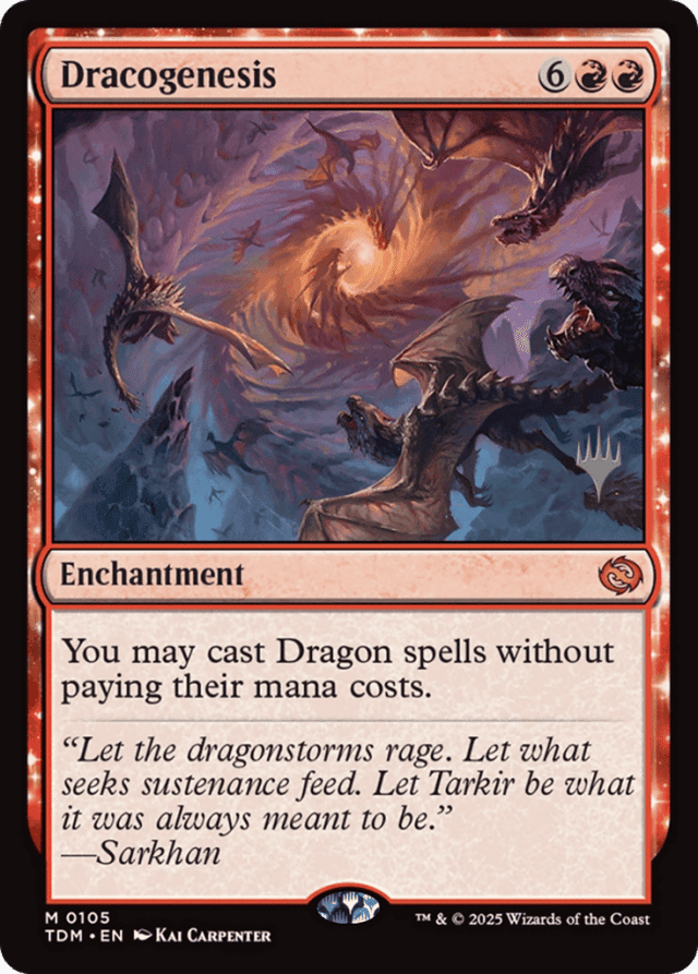 If a spell has {X} in its mana cost, you must choose 0 as the value of X when casting it without paying its mana cost. — If you cast a spell “without paying its mana cost,” you can’t choose to cast it for any alternative costs. You can, however, pay additional costs, such as kicker costs. If the spell has any mandatory additional costs those must be paid to cast the spell. — Once you cast Dracogenesis, if it’s your turn, you’ll have priority immediately after it resolves. You can cast another spell before any player can attempt to remove Dracogenesis with spells or abilities. — You must follow the normal timing permissions and restrictions of each Dragon spell you cast this way.
