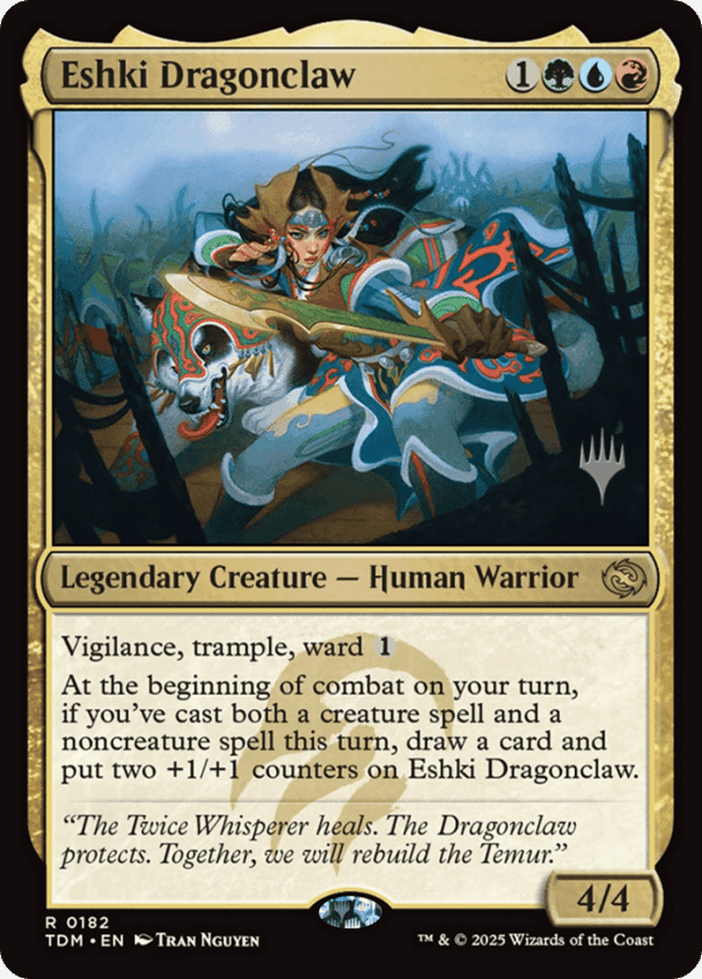 Vigilance, trample, ward {1} At the beginning of combat on your turn, if you've cast both a creature spell and a noncreature spell this turn, draw a card and put two +1/+1 counters on Eshki Dragonclaw.