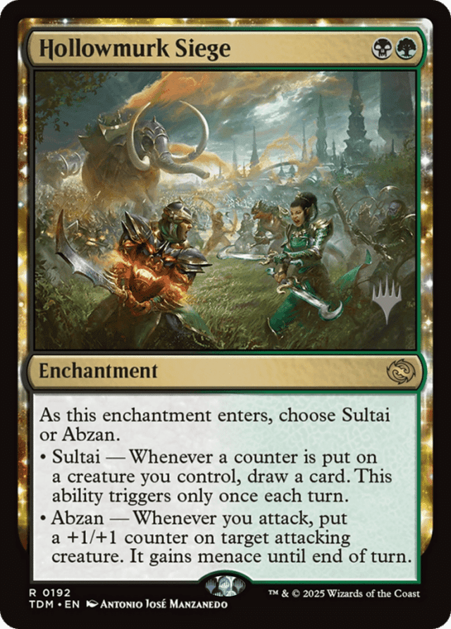 As this enchantment enters, choose Sultai or Abzan. • Sultai — Whenever a counter is put on a creature you control, draw a card. This ability triggers only once each turn. • Abzan — Whenever you attack, put a +1/+1 counter on target attacking creature. It gains menace until end of turn.