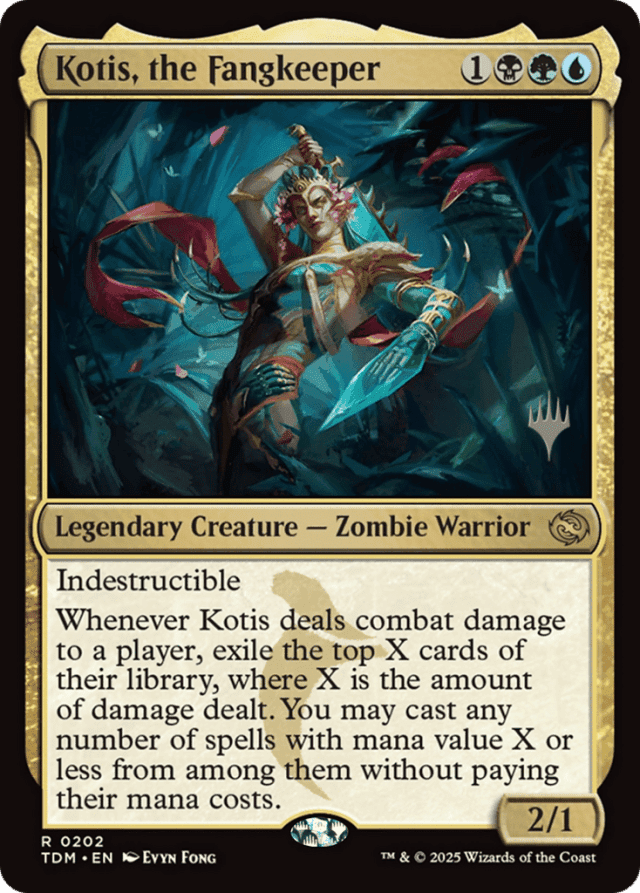 Indestructible Whenever Kotis deals combat damage to a player, exile the top X cards of their library, where X is the amount of damage dealt. You may cast any number of spells with mana value X or less from among them without paying their mana costs.