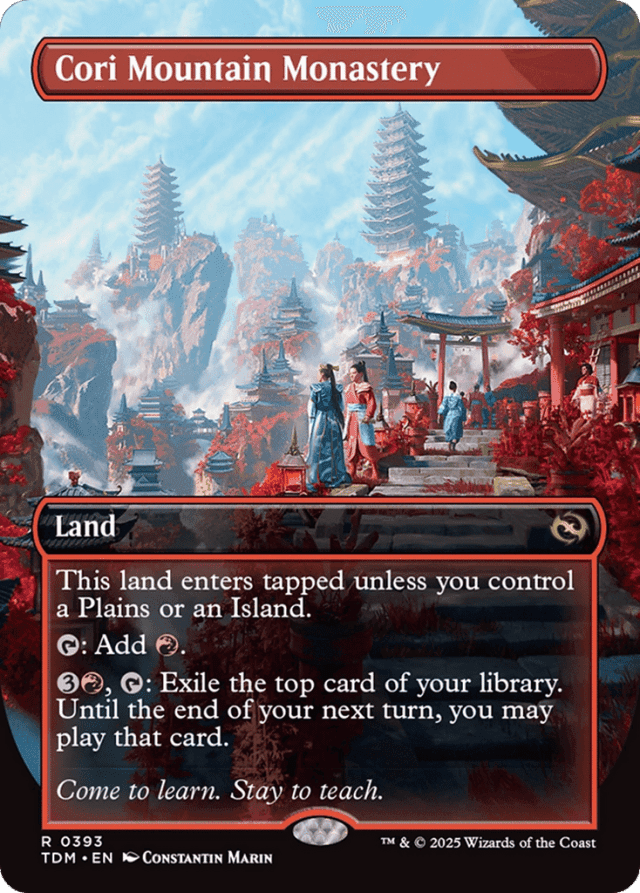 You must already control a Plains or Island as Cori Mountain Monastery enters for it to enter untapped. If it enters at the same time as a Plains or Island when you control no other Plains or Islands, it will enter tapped. — You pay all costs and follow all timing rules for cards played this way. For example, if the exiled card is a land card, you may play it only during your main phase while the stack is empty.