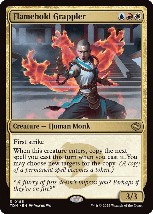 A resolving copy of a permanent spell becomes a token. That token isn’t “created” and won’t interact with abilities that care about tokens being created. — After Flamehold Grappler’s last ability resolves, the next spell you cast that turn will be copied whether or not it has targets. — If the copied spell divides damage or distributes counters among a number of targets, the division and number of targets can’t be changed. If you choose new targets, you must choose the same number of targets. — If the spell has any targets, the copy will have the same targets unless you choose new ones. You may change any number of the targets, including all of them or none of them. The new targets must be legal. — If the spell that’s copied has an X whose value was determined as it was cast, the copy will have the same value of X. — If the spell that’s copied is modal (that is, it says “Choose one —” or the like), the copy will have the same mode or modes. You can’t choose different ones. — The copy created by Flamehold Grappler’s last ability resolves before the spell it’s copying. It resolves even if the original spell is countered before the copy is created. — The copy is created on the stack, so it’s not “cast.” Abilities that trigger when a player casts a spell won’t trigger. — You can’t choose to pay any additional costs for the copy. However, effects based on any additional costs that were paid for the original spell are copied as though those same costs were paid for the copy too.