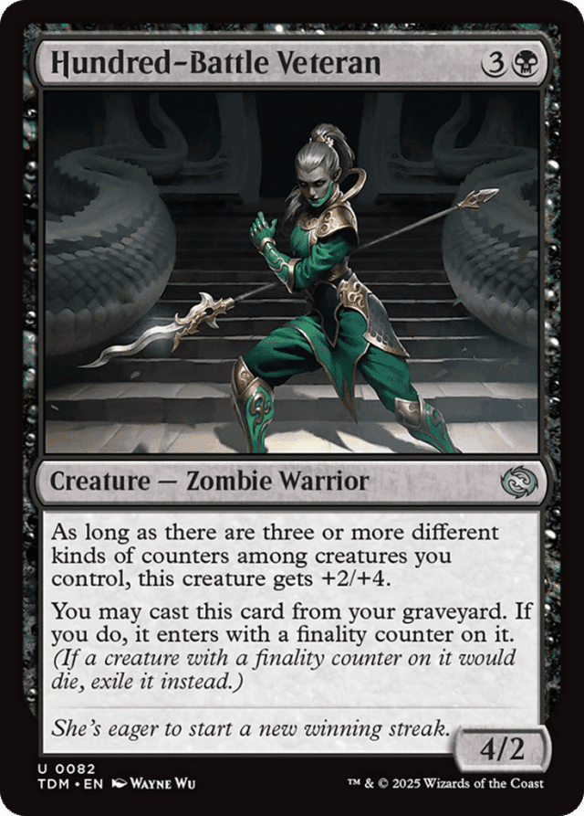 Finality counters aren’t keyword counters, and a finality counter doesn’t give any abilities to the permanent it’s on. If that permanent loses its abilities and then would go to a graveyard, it will still be exiled instead. — Finality counters don’t stop permanents from going to zones other than the graveyard from the battlefield. For example, if a permanent with a finality counter on it would be put into its owner’s hand from the battlefield, it does so normally. — If Hundred-Battle Veteran is countered after being cast from your graveyard, it will return to your graveyard. It may be cast this way again. (That doesn’t count as one of the hundred battles.) — If a permanent with a finality counter on it would be put into a graveyard from the battlefield, exile it instead. — Multiple finality counters on a single permanent are redundant. — Once you begin casting a spell from your graveyard, it immediately moves to the stack. Players can’t take any actions until you’ve finished casting the spell. — You still pay all costs and obey timing restrictions when casting Hundred-Battle Veteran from your graveyard with the permission from its last ability.