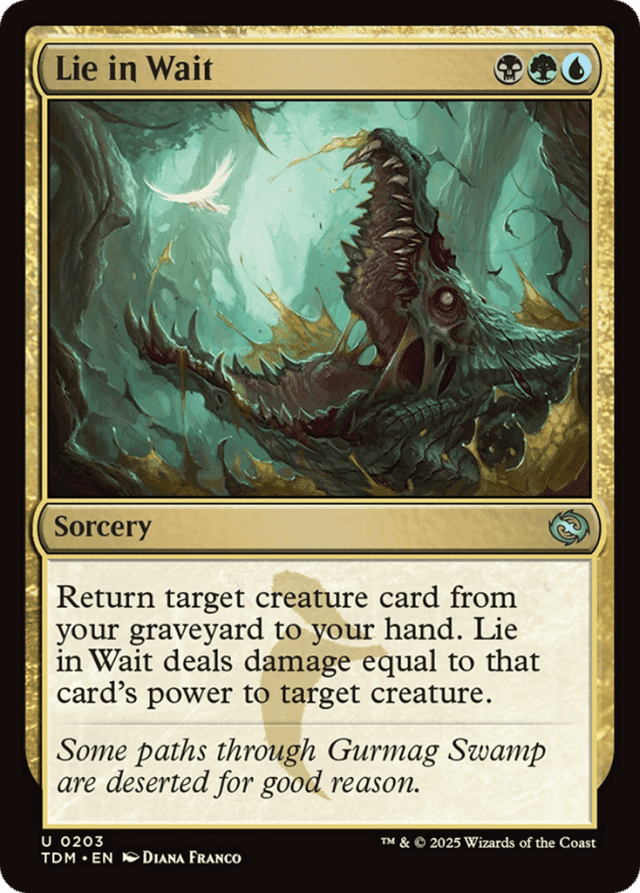 Use the power of the card in the graveyard to determine how much damage Lie in Wait deals to the target creature. — You can’t cast Lie in Wait unless you choose a creature card in your graveyard and a creature on the battlefield as targets.