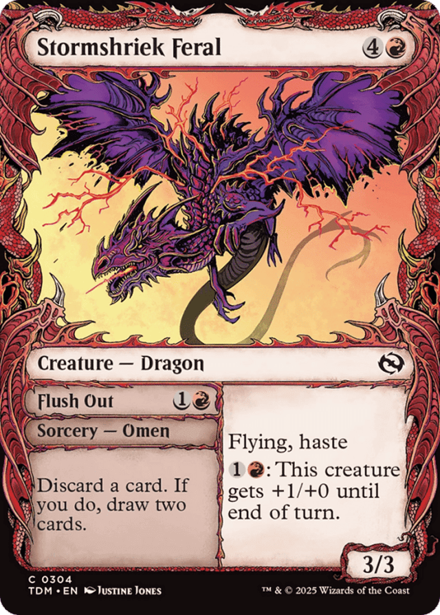 An omen card is a creature card in every zone except the stack, as well as while on the stack if not cast as an Omen. Ignore its alternative characteristics in those cases. For example, while it’s in your graveyard, Twinmaw Stormbrood is a white creature card whose mana value is 6. It can’t be the target of the reflexive ability created by Kishla Trawlers’s triggered ability (“…When you do, return target instant or sorcery card from your graveyard to your hand.”). — As a player casts an omen card, the player chooses whether they cast the card normally or as an Omen. — Casting a card as an Omen isn’t casting it for an alternative cost. Effects that allow you to cast a spell for an alternative cost or without paying its mana cost may allow you to apply those to the Omen. — If a spell is cast as an Omen, its controller shuffles it into its owner’s library instead of putting it into its owner’s graveyard as it resolves. — If an Omen spell has one or more targets and all of those targets are illegal when the spell tries to resolve, it won’t resolve. None of its effects will happen, and it will be put into its owner’s graveyard. It won’t be shuffled into its owner’s library. — If an Omen spell is copied, that copy is also an Omen and is shuffled into its owner’s library as it resolves. Its owner still shuffles their library, but the copy ceases to exist as a state-based action. — If an Omen spell is countered or an effect causes it to otherwise leave the stack, it won’t be shuffled into its owner’s library. — If an effect instructs you to choose a card name, you may choose the alternative Omen name. Consider only the alternative characteristics to determine whether that is an appropriate name to choose. — If you cast an omen card as an Omen, use only its alternative characteristics to determine whether it’s legal to cast that spell. For example, if you control Thundermane Dragon (“You may cast creature spells with power 4 or greater from the top of your library.”) and Twinmaw Stormbrood is on top of your library, you can cast Twinmaw Stormbrood, but not Charring Bite. — When casting a spell as an Omen, use the alternative characteristics and ignore all of the card’s normal characteristics. The spell’s color, mana cost, mana value, and so on are determined by only those alternative characteristics. If the spell leaves the stack, it immediately resumes using its normal characteristics.