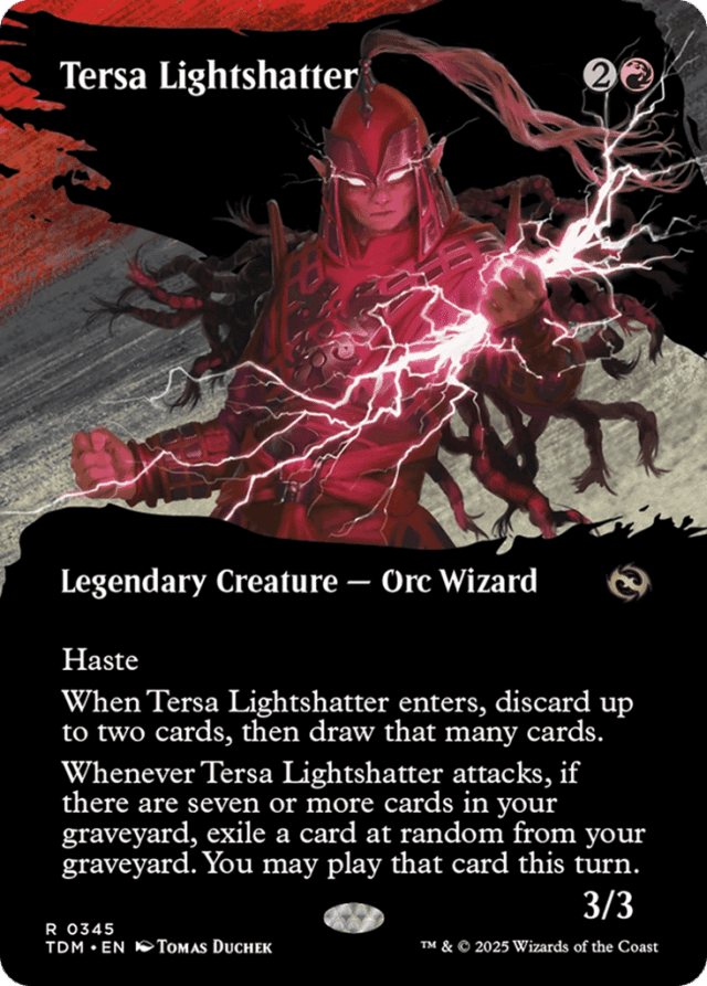 Haste When Tersa Lightshatter enters, discard up to two cards, then draw that many cards. Whenever Tersa Lightshatter attacks, if there are seven or more cards in your graveyard, exile a card at random from your graveyard. You may play that card this turn.