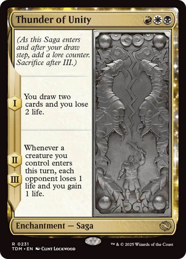 (As this Saga enters and after your draw step, add a lore counter. Sacrifice after III.) I — You draw two cards and you lose 2 life. II, III — Whenever a creature you control enters this turn, each opponent loses 1 life and you gain 1 life.