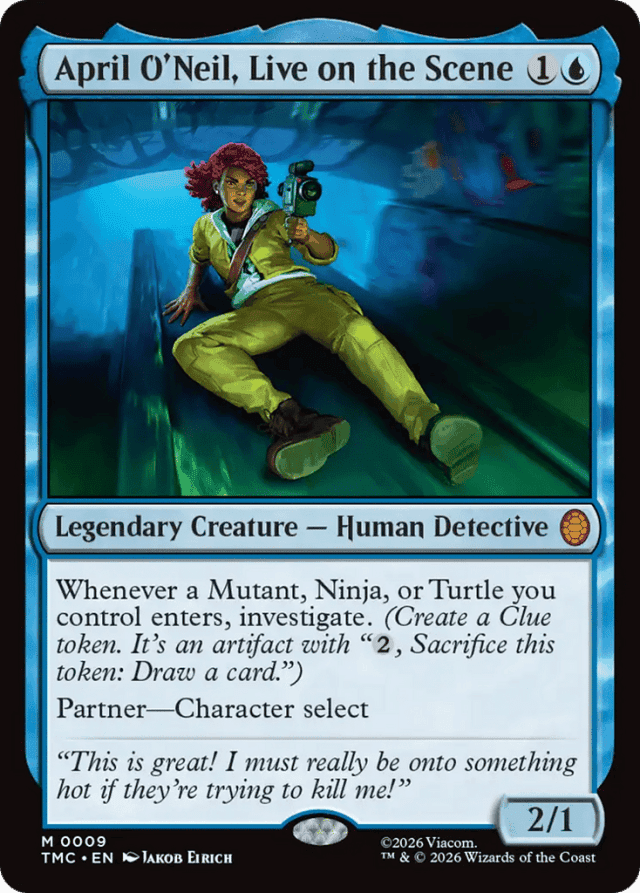 Whenever a Mutant, Ninja, or Turtle you control enters, investigate. (Create a Clue token. It's an artifact with "{2}, Sacrifice this token: Draw a card.") Partner—Character select