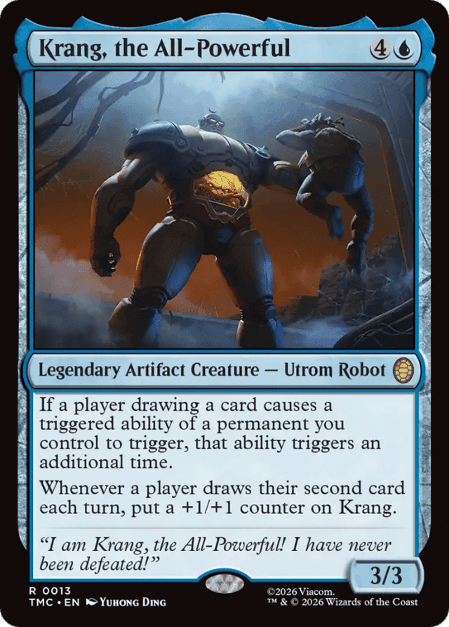 If a player drawing a card causes a triggered ability of a permanent you control to trigger, that ability triggers an additional time. Whenever a player draws their second card each turn, put a +1/+1 counter on Krang.