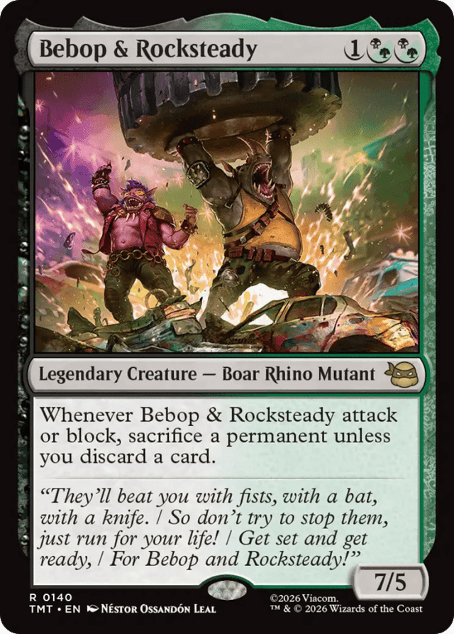 Whenever Bebop & Rocksteady attack or block, sacrifice a permanent unless you discard a card.