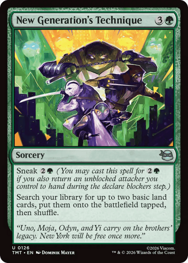 Sneak {2}{G} (You may cast this spell for {2}{G} if you also return an unblocked attacker you control to hand during the declare blockers step.) Search your library for up to two basic land cards, put them onto the battlefield tapped, then shuffle.