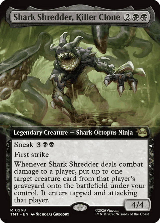 Sneak {3}{B}{B} First strike Whenever Shark Shredder deals combat damage to a player, put up to one target creature card from that player's graveyard onto the battlefield under your control. It enters tapped and attacking that player.