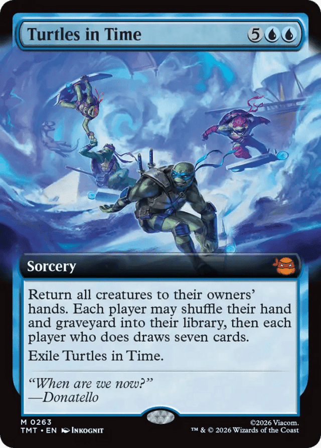 Return all creatures to their owners' hands. Each player may shuffle their hand and graveyard into their library, then each player who does draws seven cards. Exile Turtles in Time.