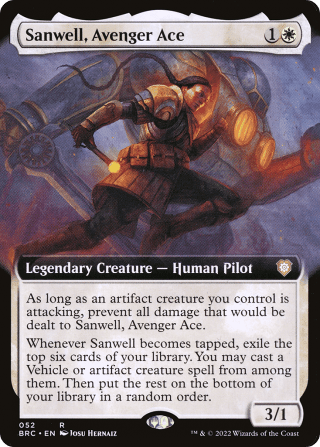 As long as an artifact creature you control is attacking, prevent all damage that would be dealt to Sanwell. Whenever Sanwell becomes tapped, exile the top six cards of your library. You may cast a Vehicle or artifact creature spell from among them. Then put the rest on the bottom of your library in a random order.