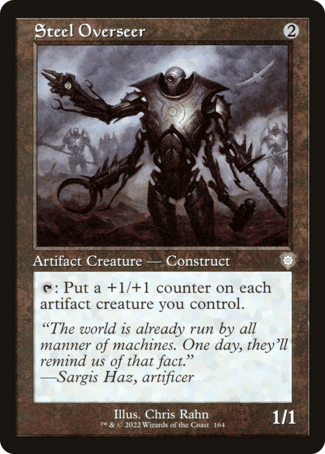 Steel Overseer's ability puts a +1/+1 counter on each artifact creature you control, including Steel Overseer.