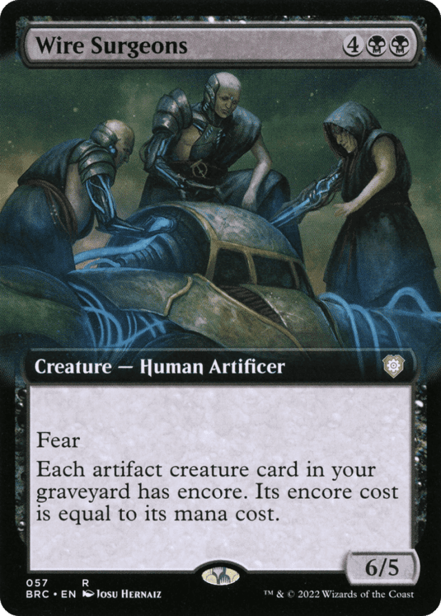 Fear (This creature can't be blocked except by artifact creatures and/or black creatures.) Each artifact creature card in your graveyard has encore. Its encore cost is equal to its mana cost. (Exile it and pay its mana cost: For each opponent, create a token copy that attacks that opponent this turn if able. They gain haste. Sacrifice them at the beginning of the next end step. Activate only as a sorcery.)