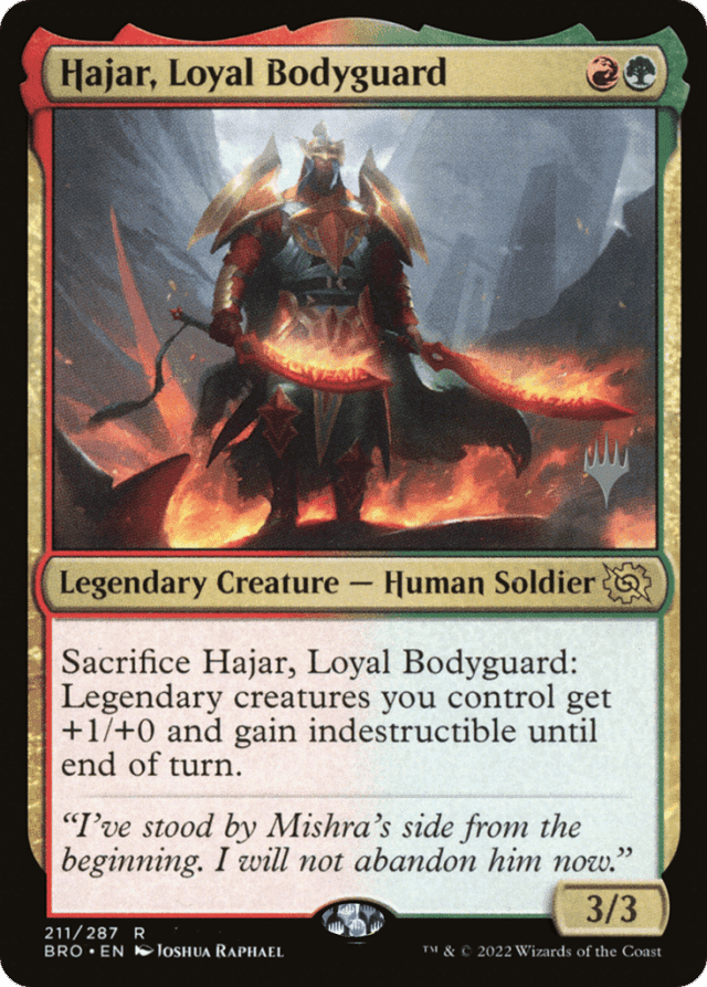 Sacrifice Hajar: Legendary creatures you control get +1/+0 and gain indestructible until end of turn.
