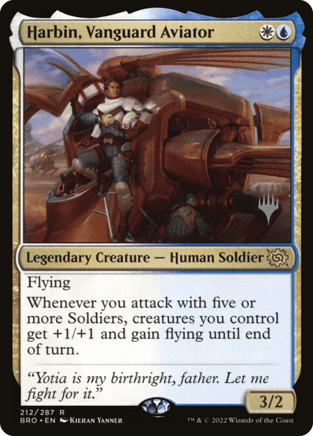 Flying Whenever you attack with five or more Soldiers, creatures you control get +1/+1 and gain flying until end of turn.