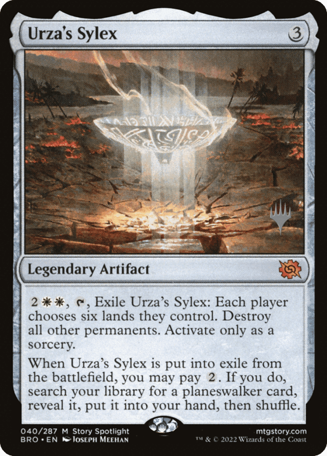 {2}{W}{W}, {T}, Exile Urza's Sylex: Each player chooses six lands they control. Destroy all other permanents. Activate only as a sorcery. When Urza's Sylex is put into exile from the battlefield, you may pay {2}. If you do, search your library for a planeswalker card, reveal it, put it into your hand, then shuffle.