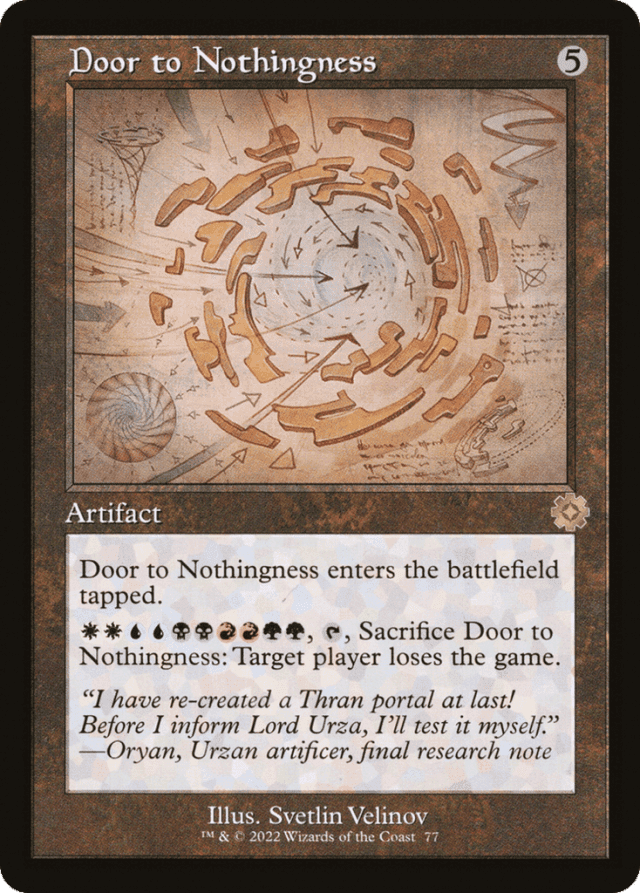 This artifact enters tapped. {W}{W}{U}{U}{B}{B}{R}{R}{G}{G}, {T}, Sacrifice this artifact: Target player loses the game.