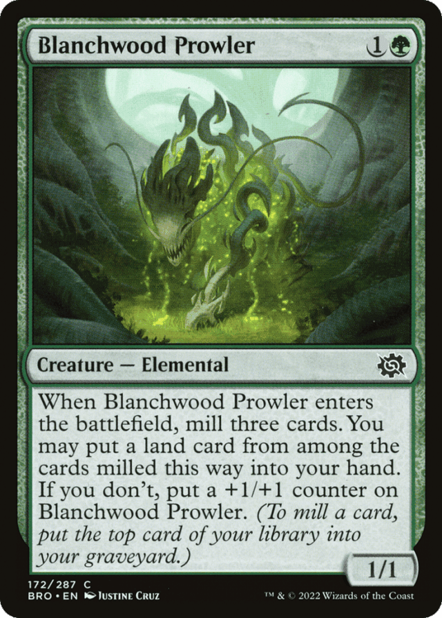 When this creature enters, mill three cards. You may put a land card from among the cards milled this way into your hand. If you don't, put a +1/+1 counter on this creature. (To mill a card, put the top card of your library into your graveyard.)
