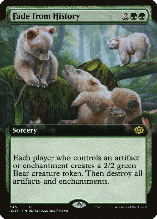 Each player who controls an artifact or enchantment creates a 2/2 green Bear creature token. Then destroy all artifacts and enchantments.