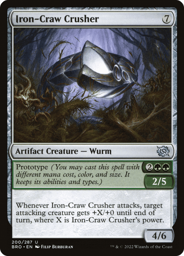 Prototype {2}{G}{G} — 2/5 (You may cast this spell with different mana cost, color, and size. It keeps its abilities and types.) Whenever this creature attacks, target attacking creature gets +X/+0 until end of turn, where X is this creature's power.