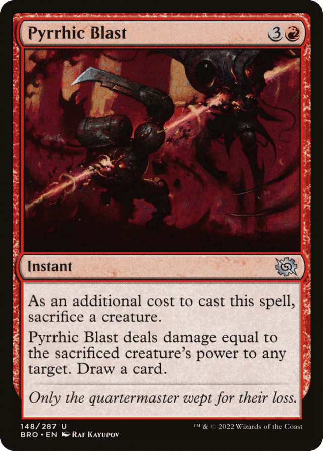As an additional cost to cast this spell, sacrifice a creature. Pyrrhic Blast deals damage equal to the sacrificed creature's power to any target. Draw a card.