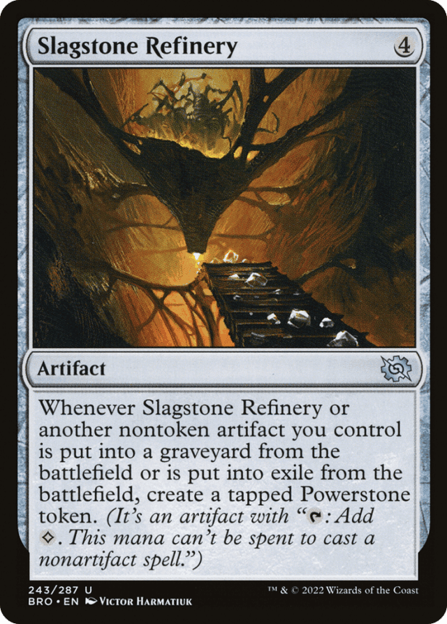 Although all the cards in The Brothers' War that create Powerstone tokens create a tapped Powerstone token, entering the battlefield tapped isn't part of the token's definition. Notably, if you create a token that is a copy of a Powerstone token, the token copy won't enter the battlefield tapped. — If Slagstone Refinery is put into a graveyard from the battlefield or exiled from the battlefield at the same time that one or more other nontoken artifacts controlled by the same player are put into a graveyard from the battlefield and/or exiled from the battlefield, its triggered ability will trigger once for each of them plus once for itself. — Powerstone tokens are a kind of predefined token. Each one has the artifact subtype "Powerstone" and the ability "{T}: Add {C}. This mana can't be spent to cast a nonartifact spell." — You can use the {C} added by a Powerstone token on anything that isn't a nonartifact spell. This includes paying costs to activate abilities of both artifact and nonartifact permanents, paying ward costs, and so on.